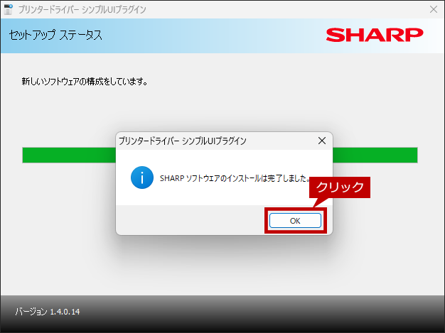 「SHARPソフトウェアのインストールは完了しました。」と表示されますので、[OK]ボタンをクリックします。