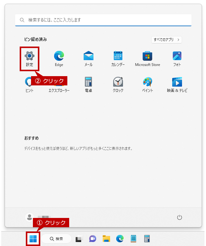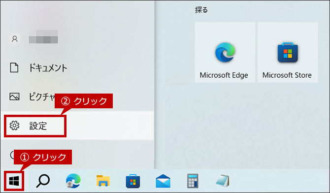 [スタート]ボタンをクリックし、表示されたメニューにある[設定]ボタン(歯車のマーク)をクリックします。