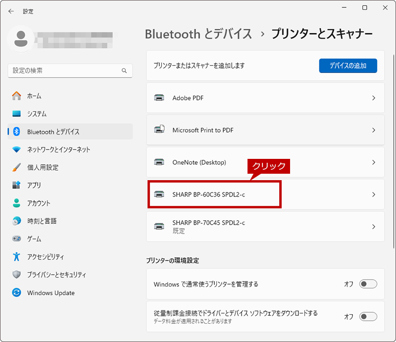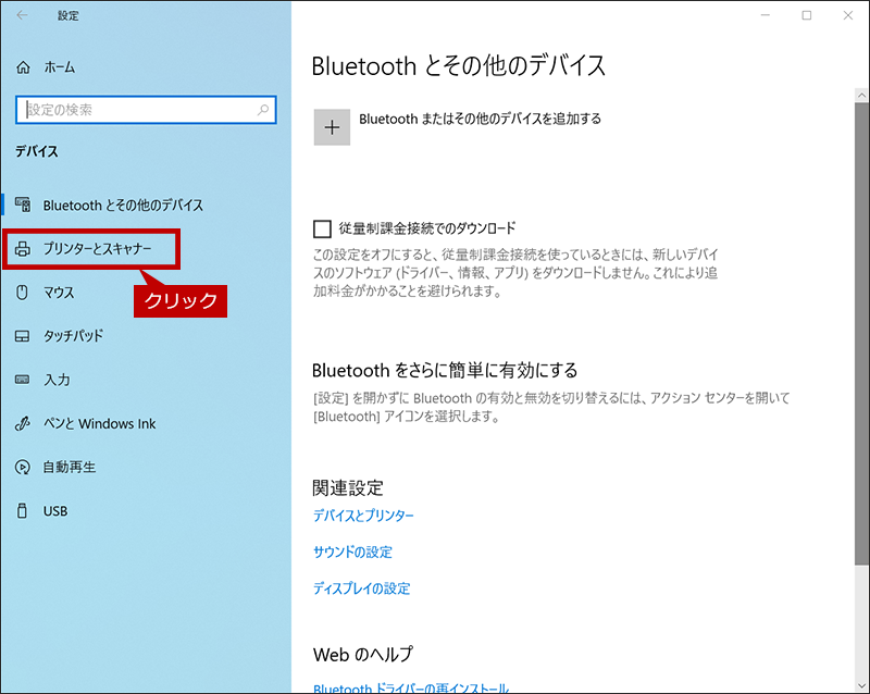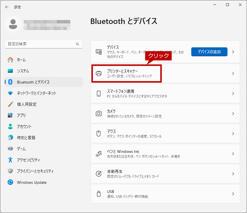 「Bluetoothとデバイス」画面が表示されますので、[プリンターとスキャナー]をクリックします。