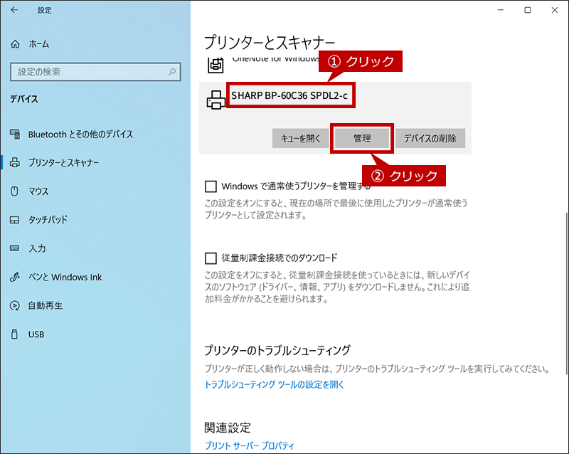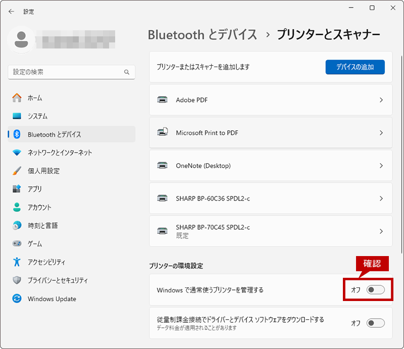 4. 「Windowsで通常使うプリンターを管理する」をオフにする。