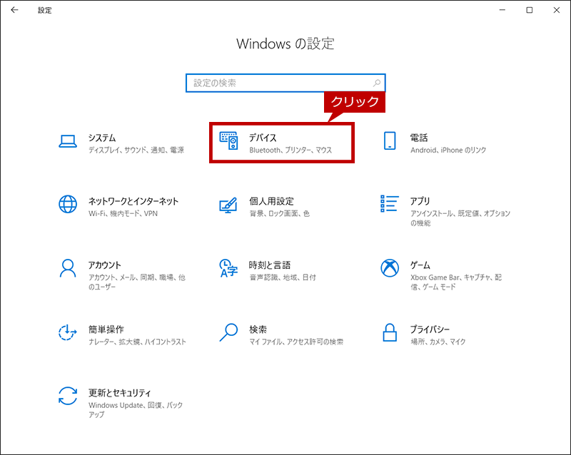 「Windowsの設定」画面が表示されますので、[デバイス]をクリックします。