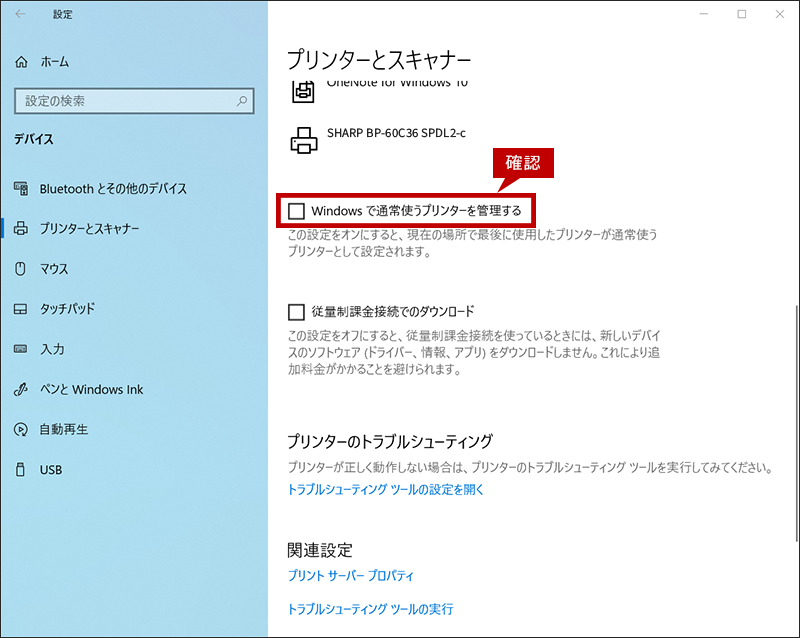 プリンターの一覧が表示されますので、ページの下にある「Windowsで通常使うプリンターを管理する」のチェックがはずれていることを確認します。
