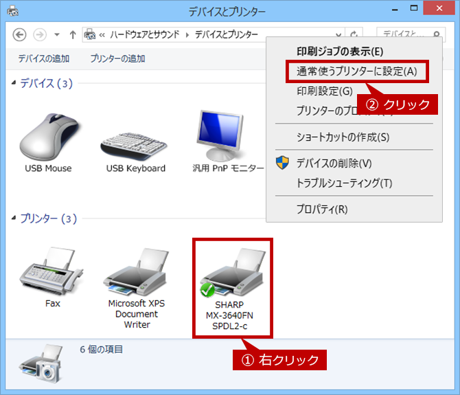 利用する複合機を右クリックし、表示されたメニューにある[通常使うプリンターに設定]をクリックします。