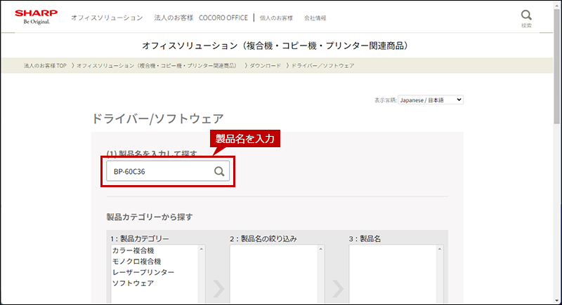 プリンタードライバーのダウンロードページで、製品名を入力します。