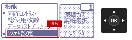 2. 「機能」画面が表示されますので、[▼]を押して[システム設定]を選択し、[OK]を押します。