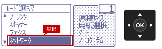 4. 「モード選択」画面が表示されますので、[▲][▼]を押して[ネットワーク]を選択し、[OK]を押します。