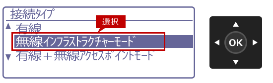 6. 「接続タイプ」画面が表示されますので、[▲][▼]を押して[無線インフラストラクチャーモード]を選択し、[OK]を押します。