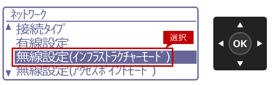 8. 「ネットワーク」画面に戻りましたら、[▲][▼]を押して[無線設定(インフラストラクチャーモード)]を選択し、[OK]を押します。