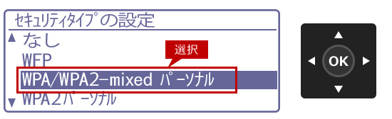 12. 「セキュリティタイプの設定」画面が表示されますので、[▲][▼]を押してセキュリティタイプを選択し、[OK]を押します。