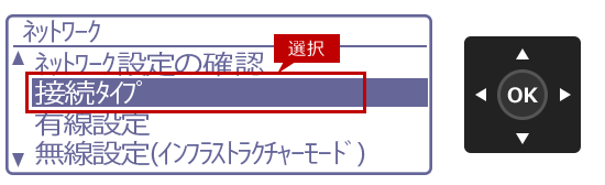 5. 「ネットワーク」画面が表示されますので、[▲][▼]を押して[接続タイプ]を選択し、[OK]を押します。