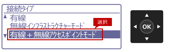 6. 「接続タイプ」画面が表示されますので、[▲][▼]を押して[有線+無線アクセスポイントモード]を選択し、[OK]を押します。