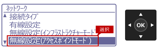 8. 「ネットワーク」画面に戻りましたら、[▲][▼]を押して[無線設定(アクセスポイントモード)]を選択し、[OK]を押します。