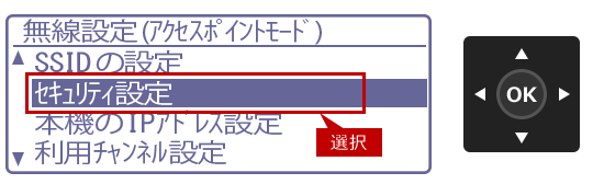 12. 「無線設定(アクセスポイントモード)」画面に戻りますので、[▲][▼]を押して[セキュリティ設定]を選択し、[OK]を押します。