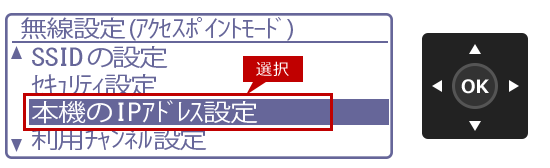 17. 「無線設定(アクセスポイントモード)」画面に戻りますので、[▲][▼]を押して[本機のIPアドレス設定]を選択し、[OK]を押します。