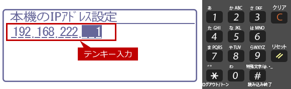 18. 「本機のIPアドレス設定」画面が表示されますので、テンキーを使ってIPアドレスを入力します。