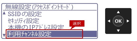 20. 「無線設定(アクセスポイントモード)」画面に戻りますので、[▲][▼]を押して[利用チャンネル設定]を選択し、[OK]を押します。
