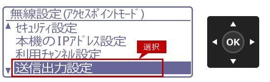 22. 「無線設定(アクセスポイントモード)」画面に戻りますので、[▲][▼]を押して[送信出力設定]を選択し、[OK]を押します。