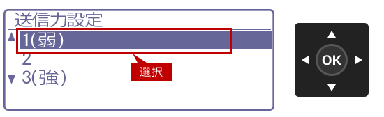23. 「送信出力設定」画面が表示されますので、[▲][▼]を押して送信出力値を選択し、[OK]を押します。