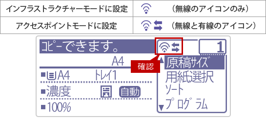 複合機の無線設定で「アクセスポイントモード」に設定します。
