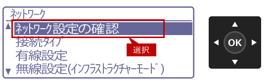 「ネットワーク」画面が表示されましたら、[▲][▼]を押して[ネットワーク設定の確認]を選択し、[OK]を押します。