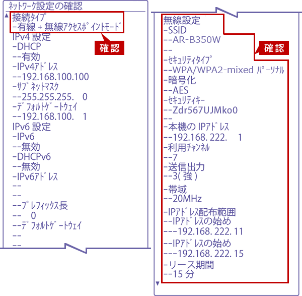 3. 「ネットワーク設定の確認」画面が表示されますので、[▲][▼]を押して各項目を確認してください。
