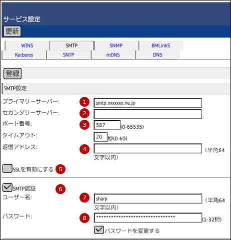SMTP認証が有効時はSMTPサーバーのユーザー名(アカウント名)を入力します。例)sharp - ⑧ パスワード:SMTP認証が有効時は⑧のユーザー(アカウント)のパスワードを入力します。