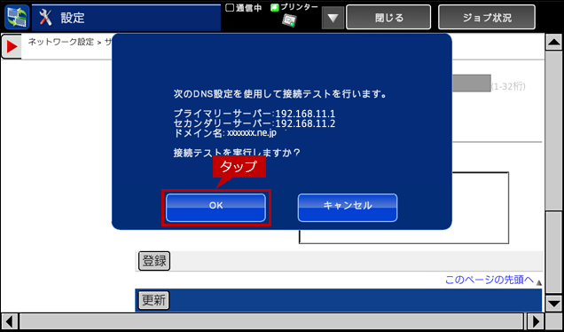 8. 「次のDNS設定を使用して接続テストを行います。」のダイアログ画面が表示されますので、[OK]をタップします。