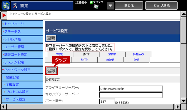 9. 接続テストに成功しますと、「SMTPサーバーへの接続テストに成功しました。[登録]ボタンで、設定を反映してください。」と表示されますので、[登録]をタップします。