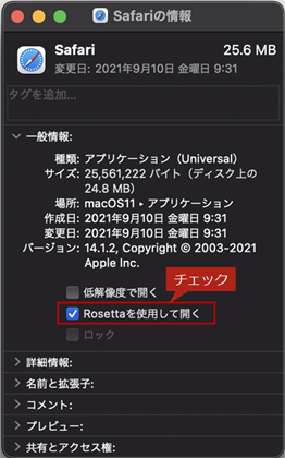 3.「Rosettaを使用して開く」のチェックを有効にします。