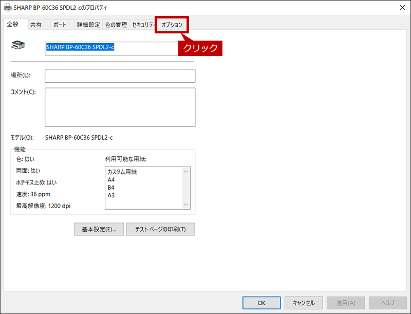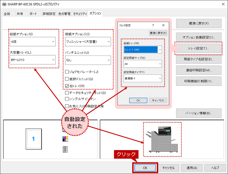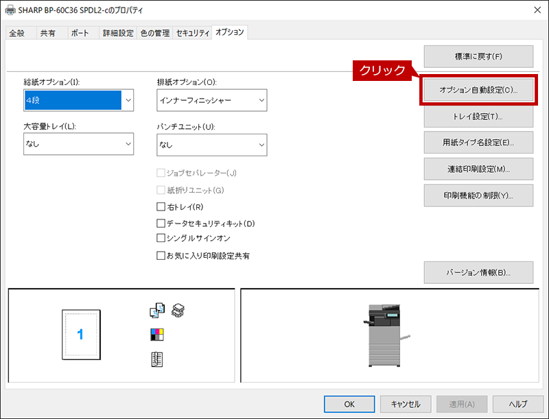 通常はプリンタードライバーをインストールすると、複合機のオプション構成にあわせて自動的に設定されます。「オプション自動設定を行う」のチェックを外した場合や変更される場合は、次の手順で設定してください。