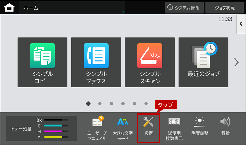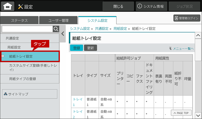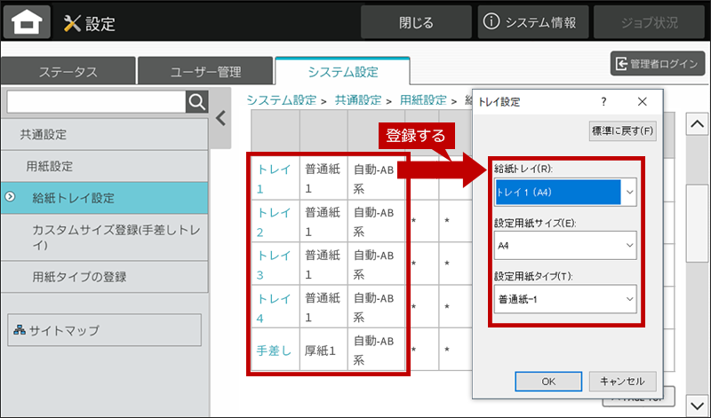 5. トレイ設定をするために、タッチパネル側でトレイ設定を確認する。