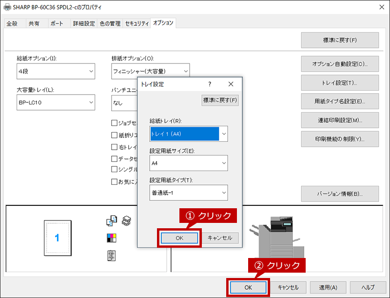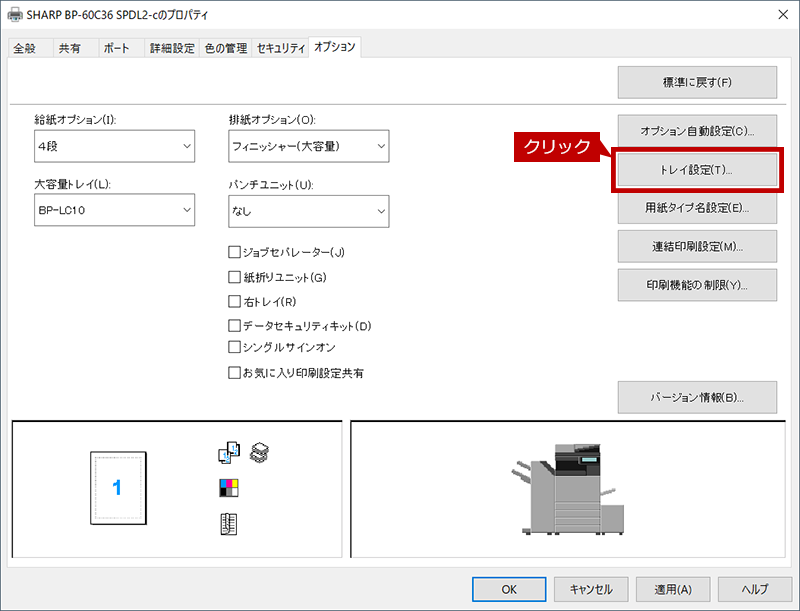 プリンタードライバーをインストールした後は、複合機に装着している給紙トレイやフィニッシャーなどが使えるよう、プリンタードライバーに設定をします。