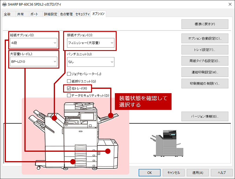 給排紙オプションなどは、装着状態を目視で確認して選択します。