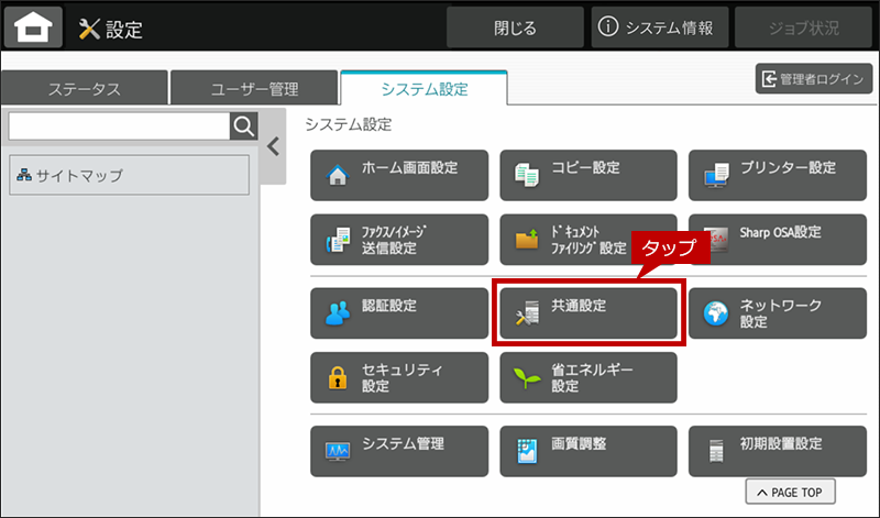 [システム設定]タブにある[共通設定]ボタンをタップします。