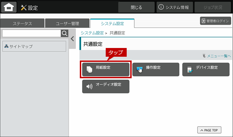 「共通設定」画面が表示されますので、[用紙設定]ボタンをタップします。