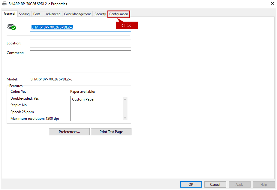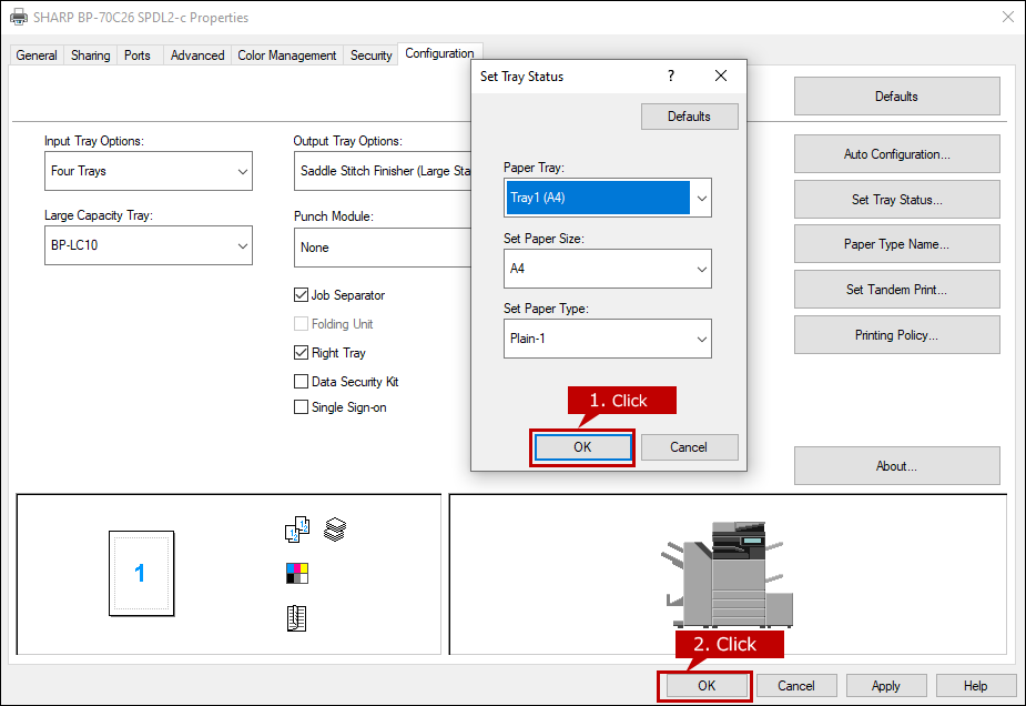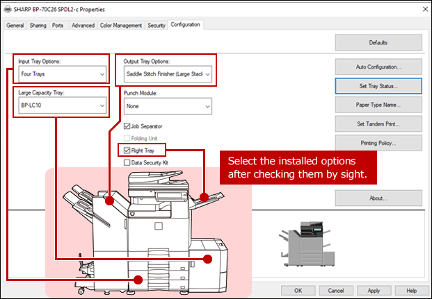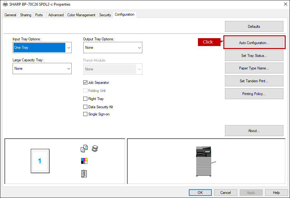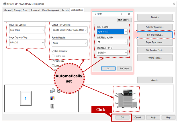 When you installed a printer driver you need to configure the driver to accommodate installed trays and finisher etc. to the machine. Normally, this setup is automatically set at the installation of a printer driver to accommodate MFP’s optional device configuration. When you unchecked [Auto Configuration] or change the settings, please follow the procedure below.