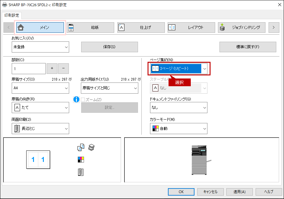 4.「印刷設定」画面が表示されますので、[メイン]タブをクリックし、「ページ集約(N)」を「例:2ページ(リピート)」に設定し[OK]をクリックします。