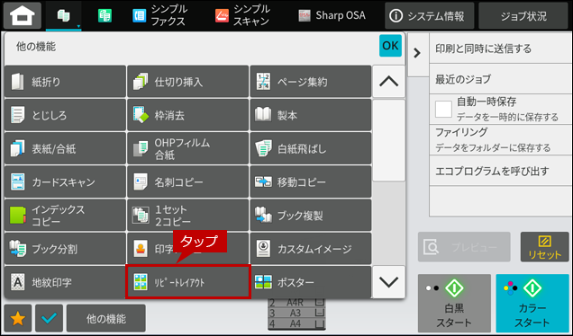 5. 「他の機能」画面が表示されますので、[リピートレイアウト]をタップします。
