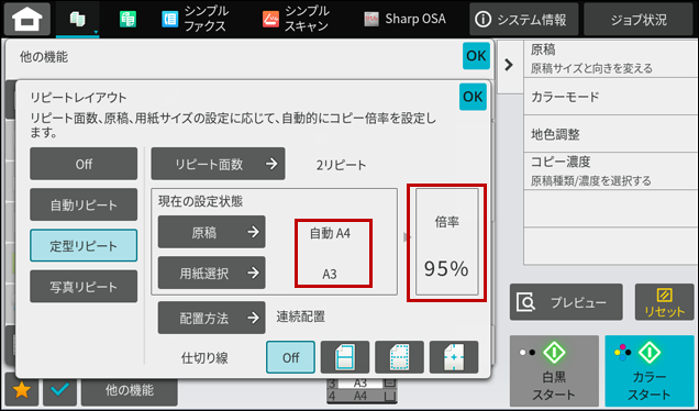 6. 「リピートレイアウト」画面が表示されますので、[原稿(例:A4)]と[用紙(例:A3)]を設定後、倍率が95%になっていることを確認します。