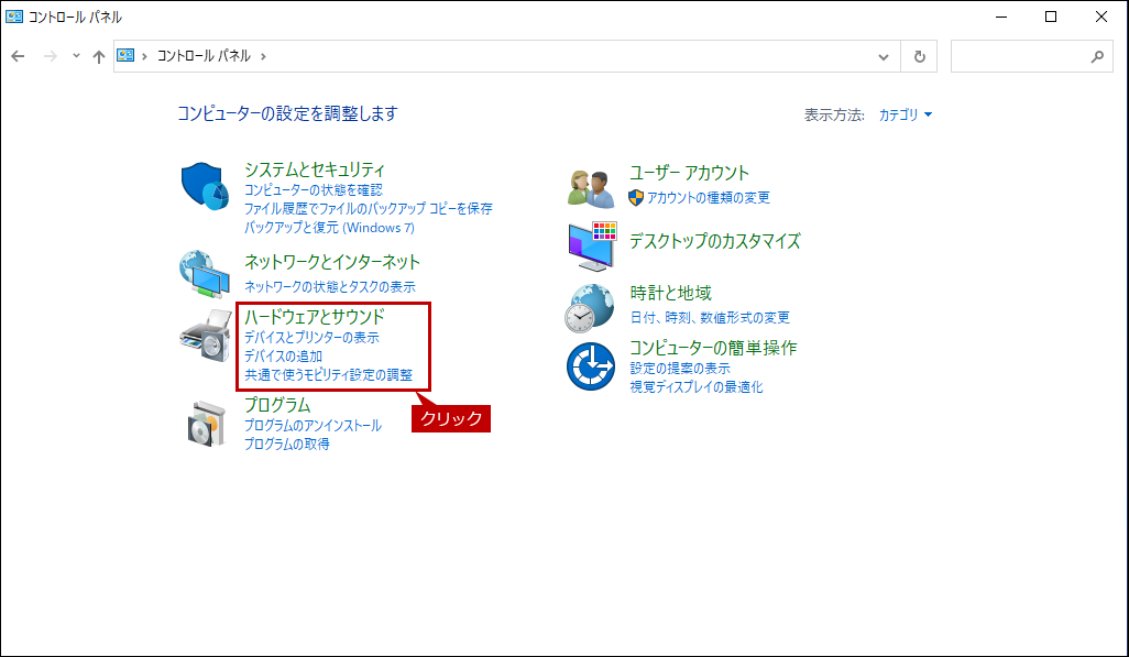 1.「コントロールパネル」の[デバイスとプリンターの表示]をクリックします。