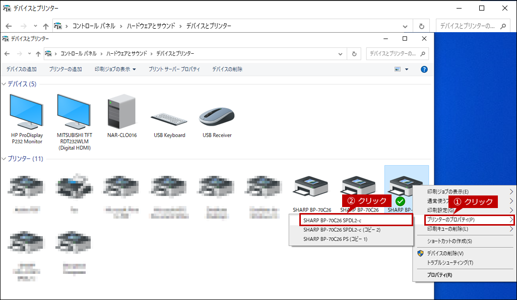 2.「デバイスとプリンター」画面が表示されますので、使用するプリンターを選択後、右クリックして[プリンターのプロパティ(P)]をクリックします。