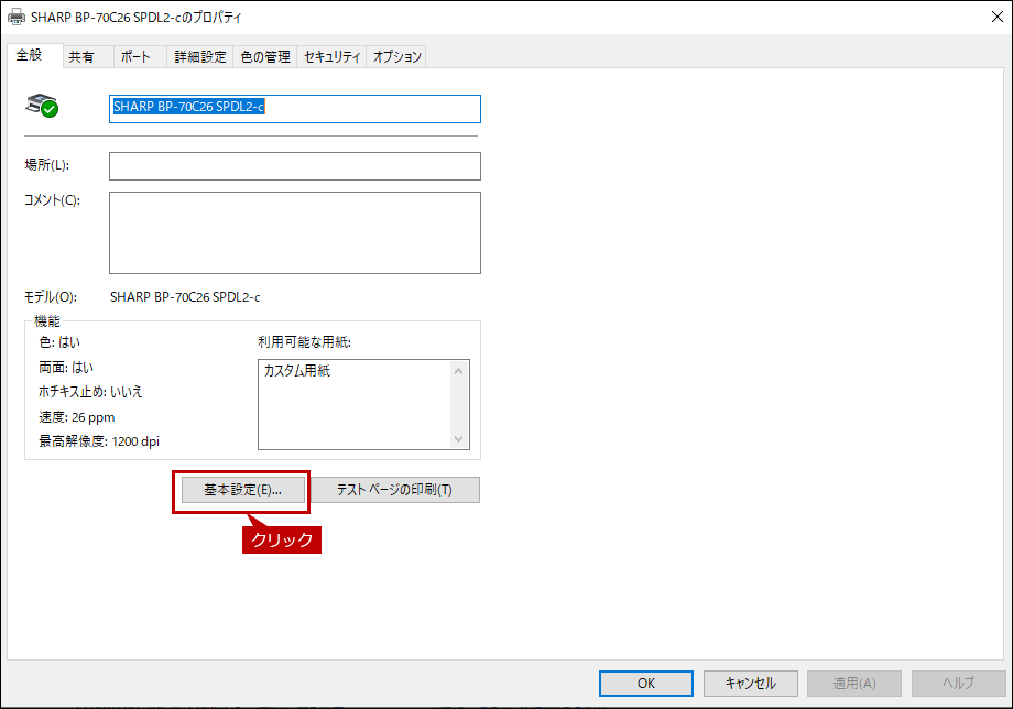 3.「(選択したプリンター)のプロパティ」画面が表示されますので、[基本設定(E)...]をクリックします。
