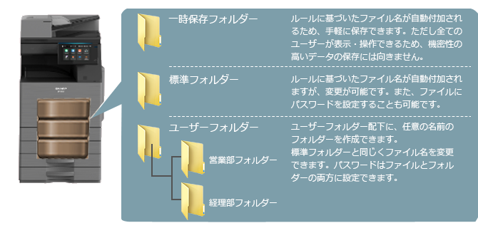 [一時保存]または[ファイリング]ボタンを選択して、複合機のハードディスクに保存してください。