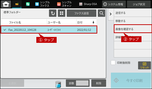 - ※ 機能を選択せずにファクスした場合は、送信のタイミングでデータが消去されるため確認することは出来ません。