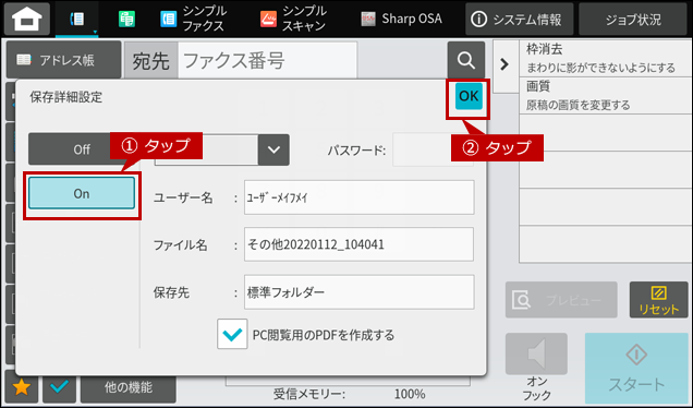 原稿を保存してファクス送信する
