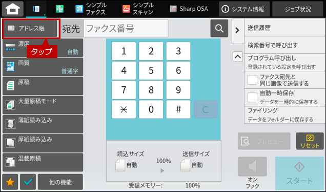 5. ファクスの宛先を指示するため、[アドレス帳]をタップします。