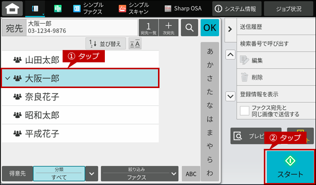 6. [宛先]をタップして、[スタート]ボタンをタップするとファクスが送信されます。