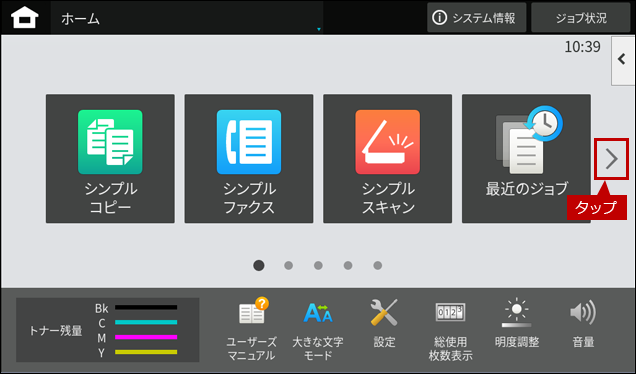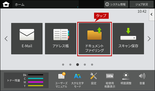 1. [ドキュメントファイリング]が表示されているページを開くため、次ページボタンをタップします。