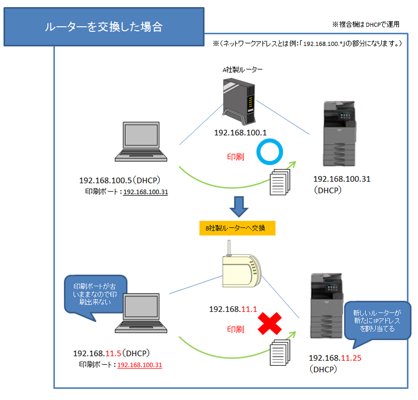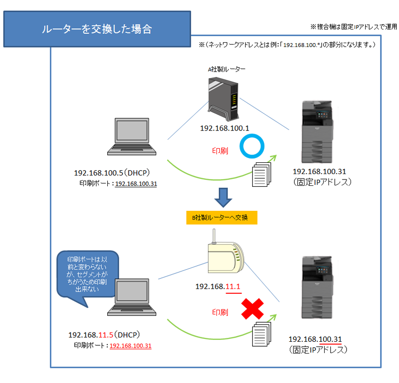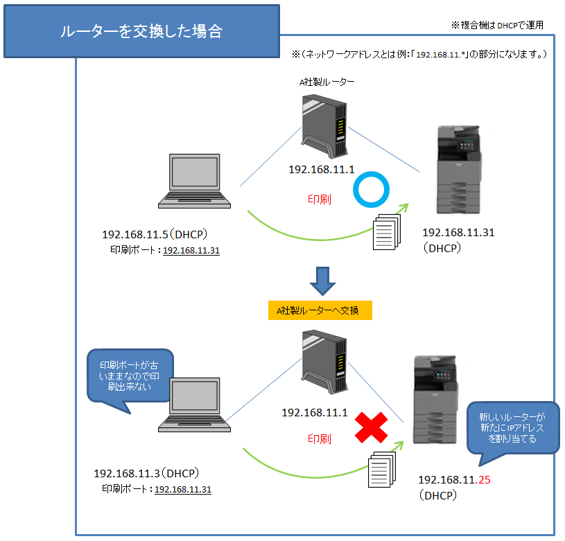 以下にルーターの交換による不具合の事象例を記載します。1:複合機のIPアドレスが固定の場合