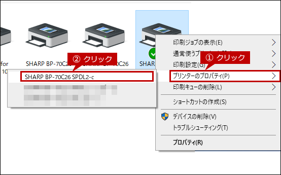 2.「デバイスとプリンター」画面が表示されますので、当該プリンターを選択後、右クリックして[プリンターのプロパティ(P)]をクリックします。